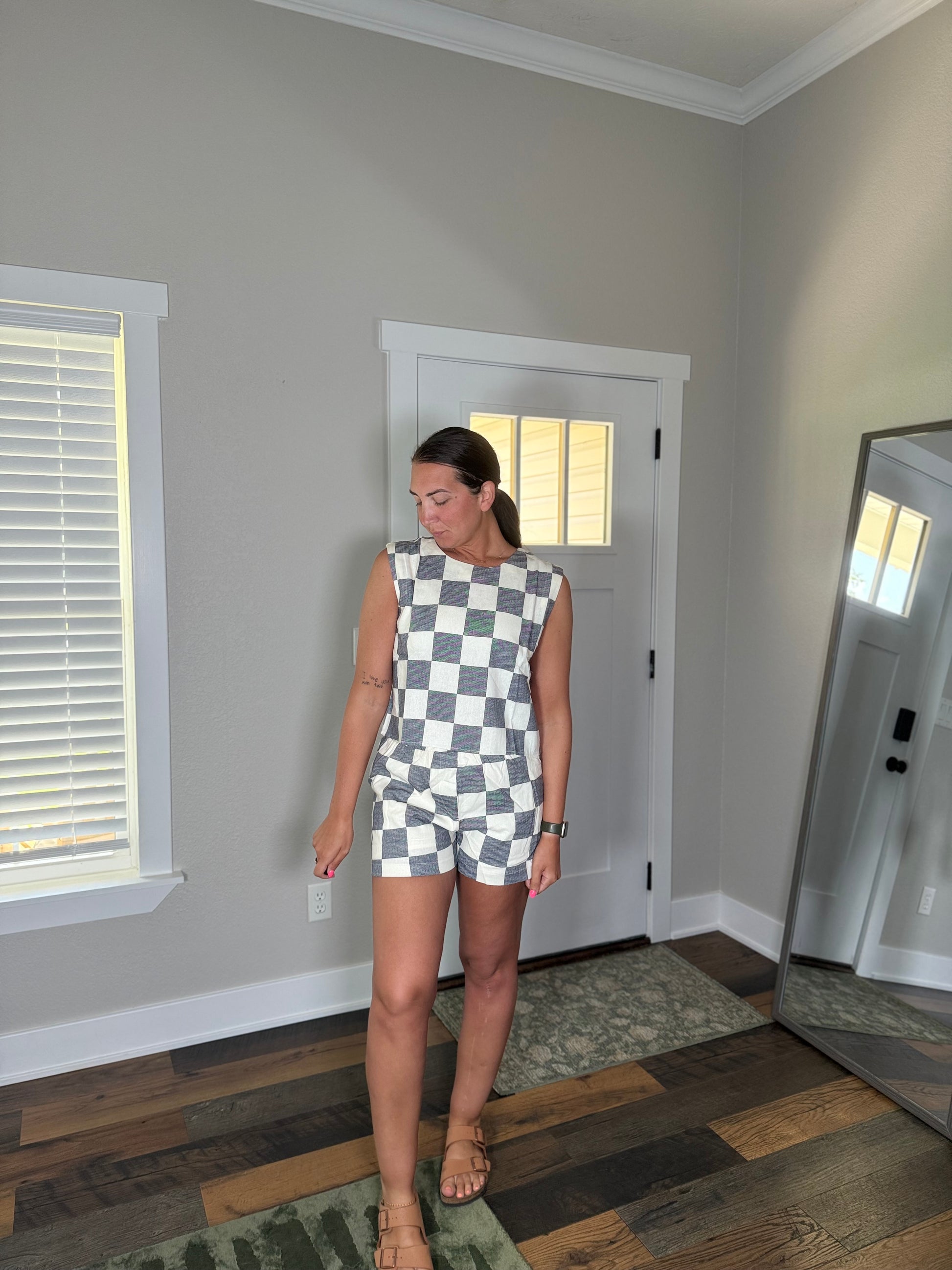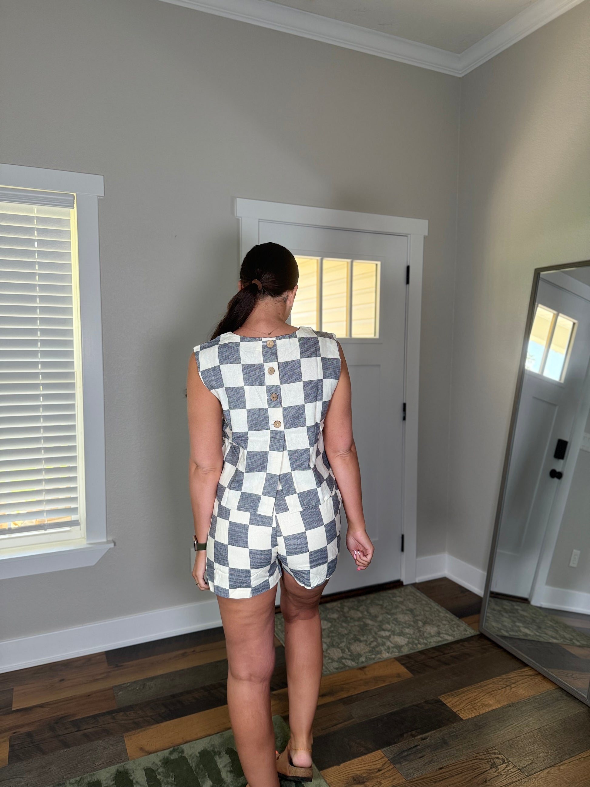 Your next style move? Total checkmate. This breezy checkered linen set features a cropped, sleeveless top with a classic round neckline and subtle back button closure. Easygoing yet totally on-point.