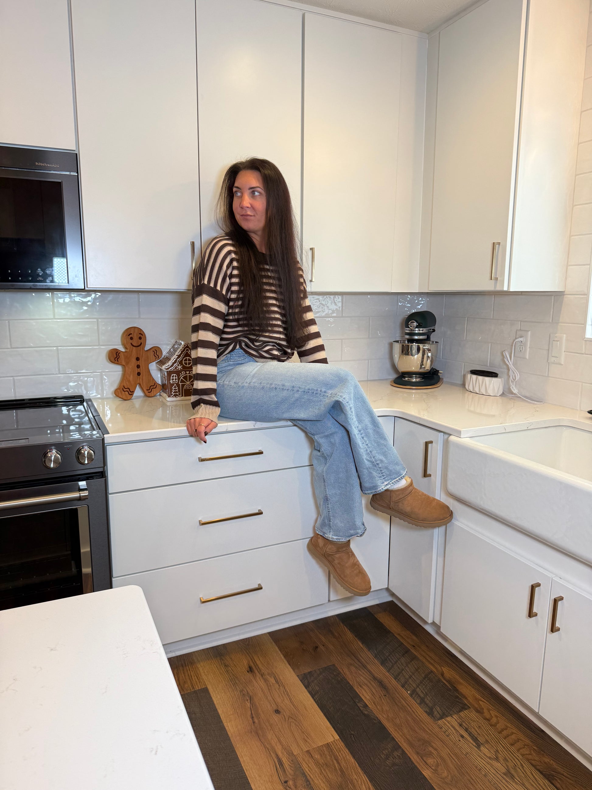 The Mocha Lines Sweater. Designed with soft brown-and-tan stripes and a relaxed, throw-on-and-go fit, this knit brings effortless style to any day. The ribbed neckline, cuffs, and hem add structure while the slouchy silhouette keeps it comfy and chic. Perfect for coffee runs, fall layering, or those “I want to look cute but stay cozy” moments.