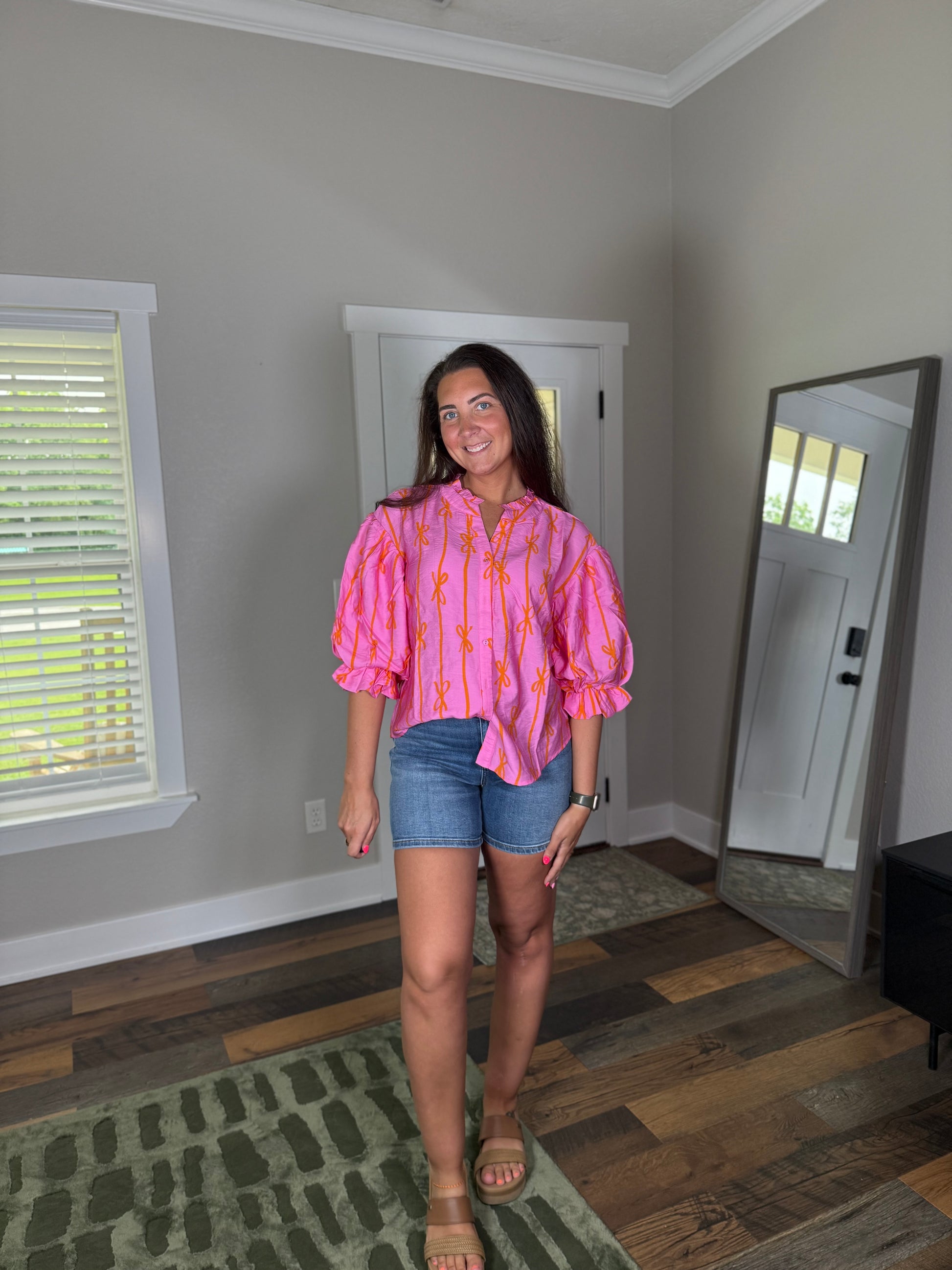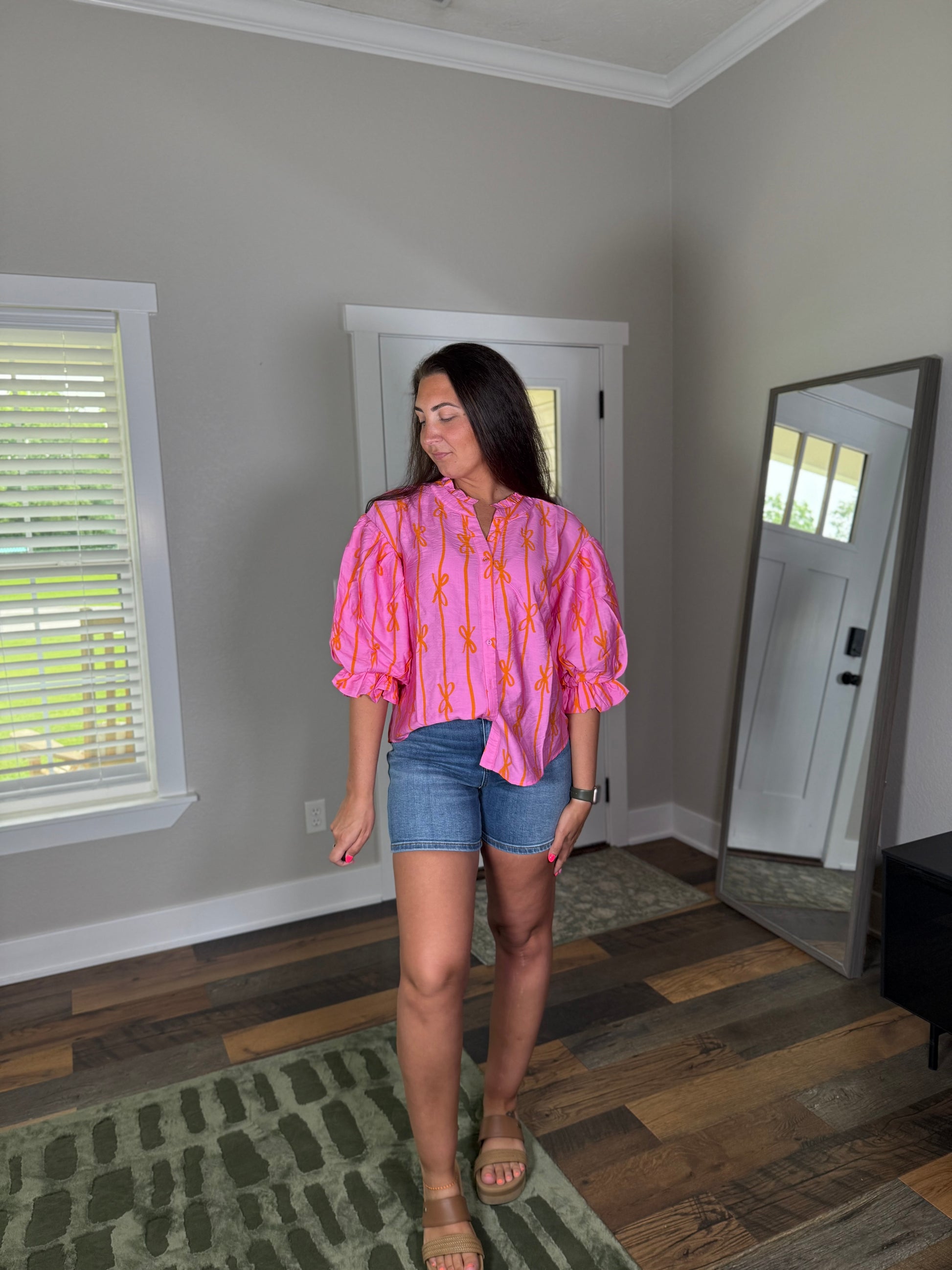 Make your outfit pop with the Pretty Please — a sweet burst of color and charm. Designed in a vibrant bubblegum pink with orange bow details, this button-down blouse brings instant joy to any look.